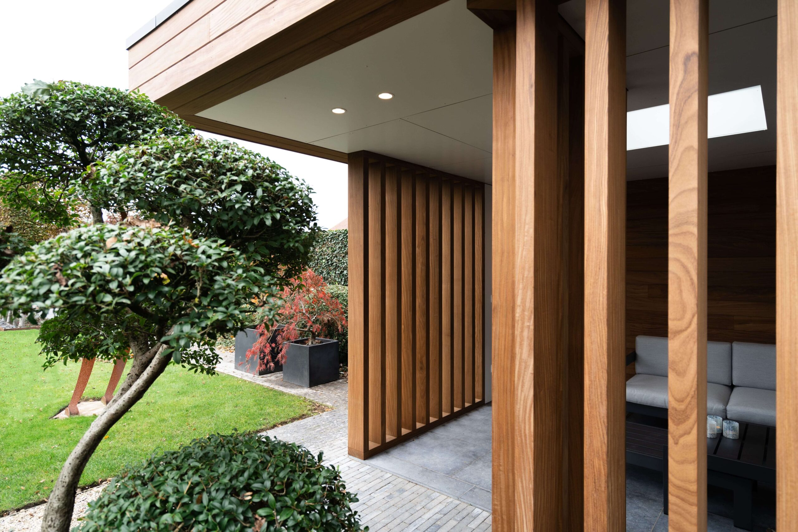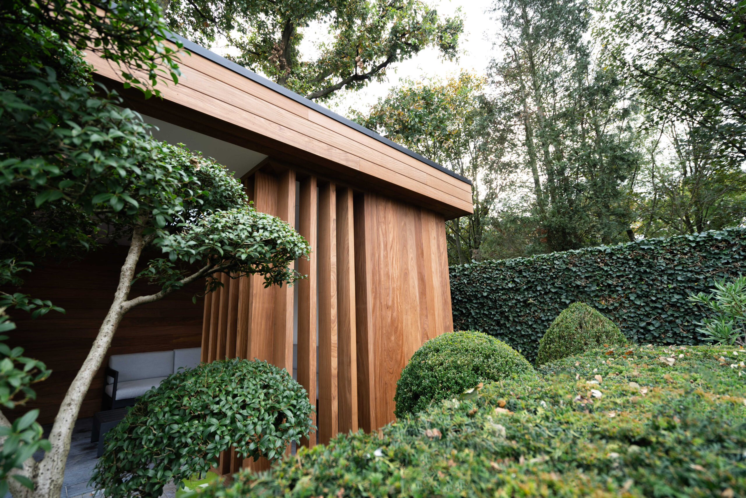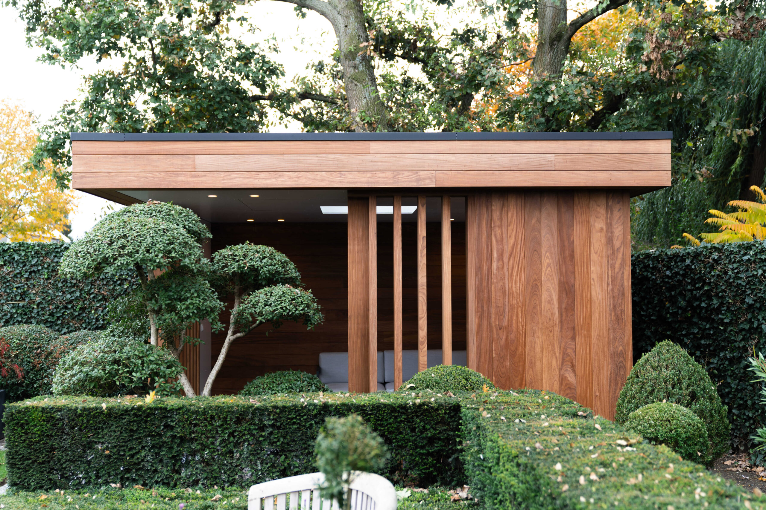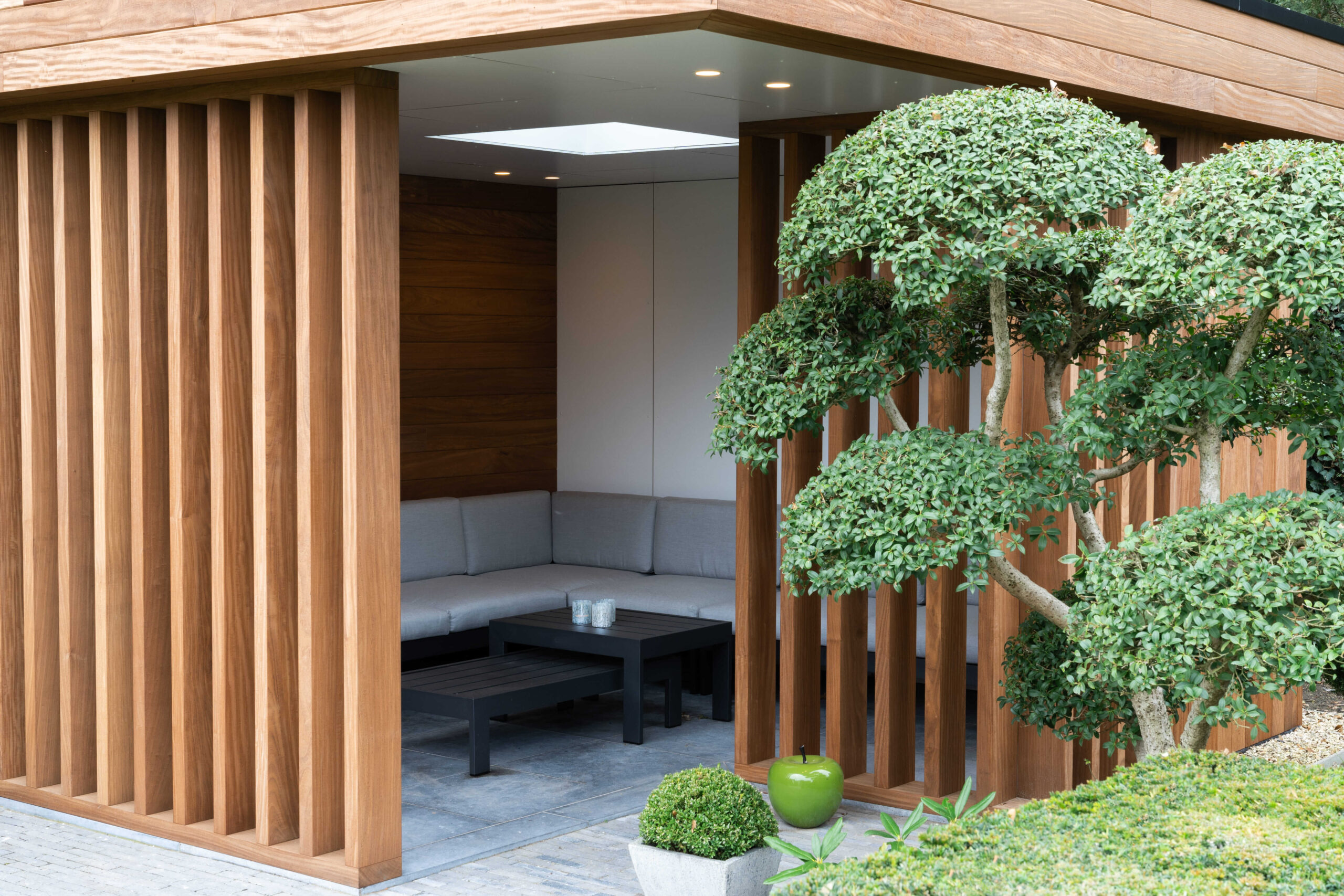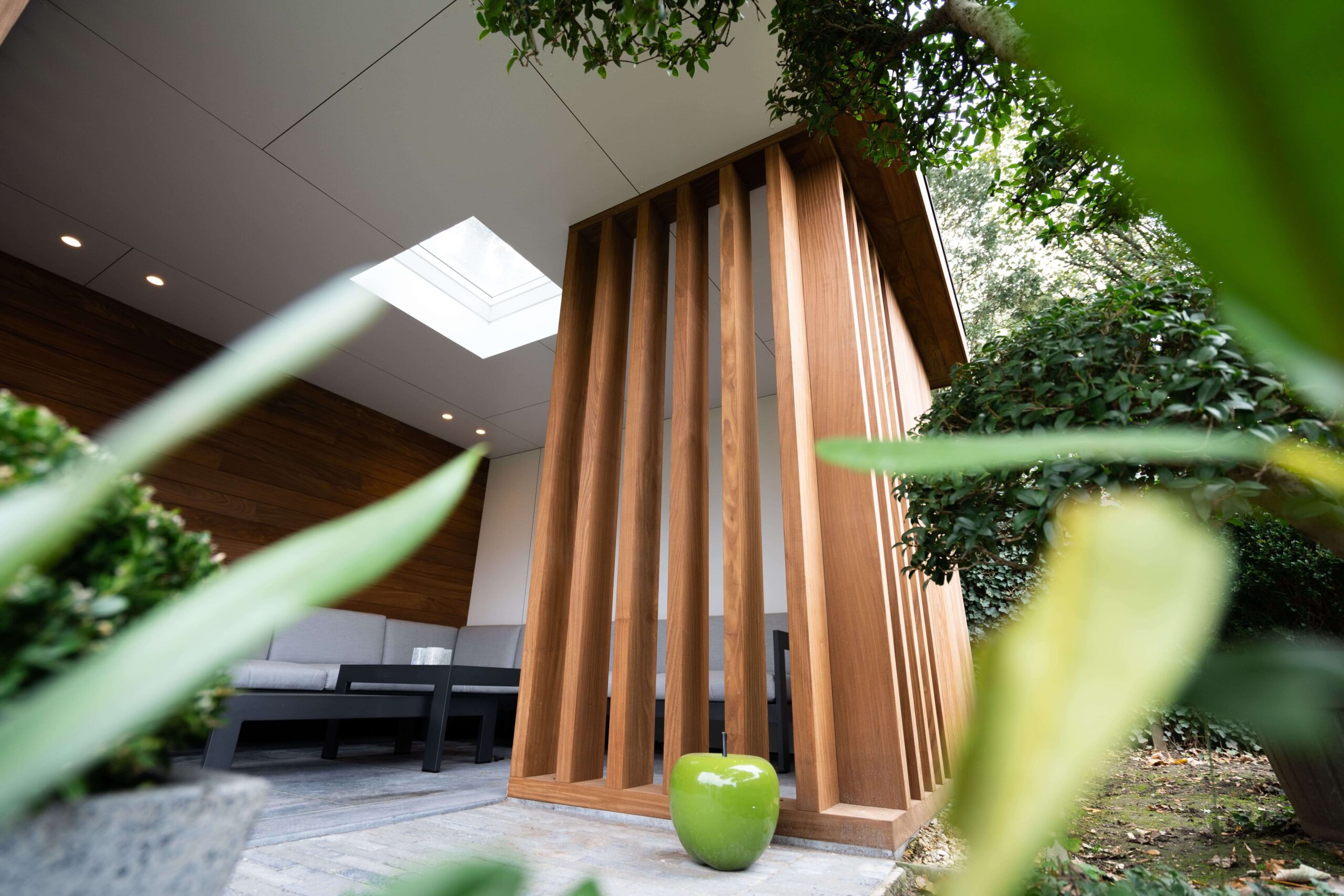 Een bijgebouw met lattenwerk houtsoort Afrormosia die opgaat in zijn natuurlijke omgeving en tuin. Het ontwerp van de houten constructie kwam er in samenspraak met de klant. Het is een ‘tuin-huis’ in de haast letterlijke betekenis van het woord. Er is plaats voor een mooie zit- en relaxruimte. Aan de binnenzijde werd gebruik gemaakt van een wit accent om het ruimtegevoel te vergroten.