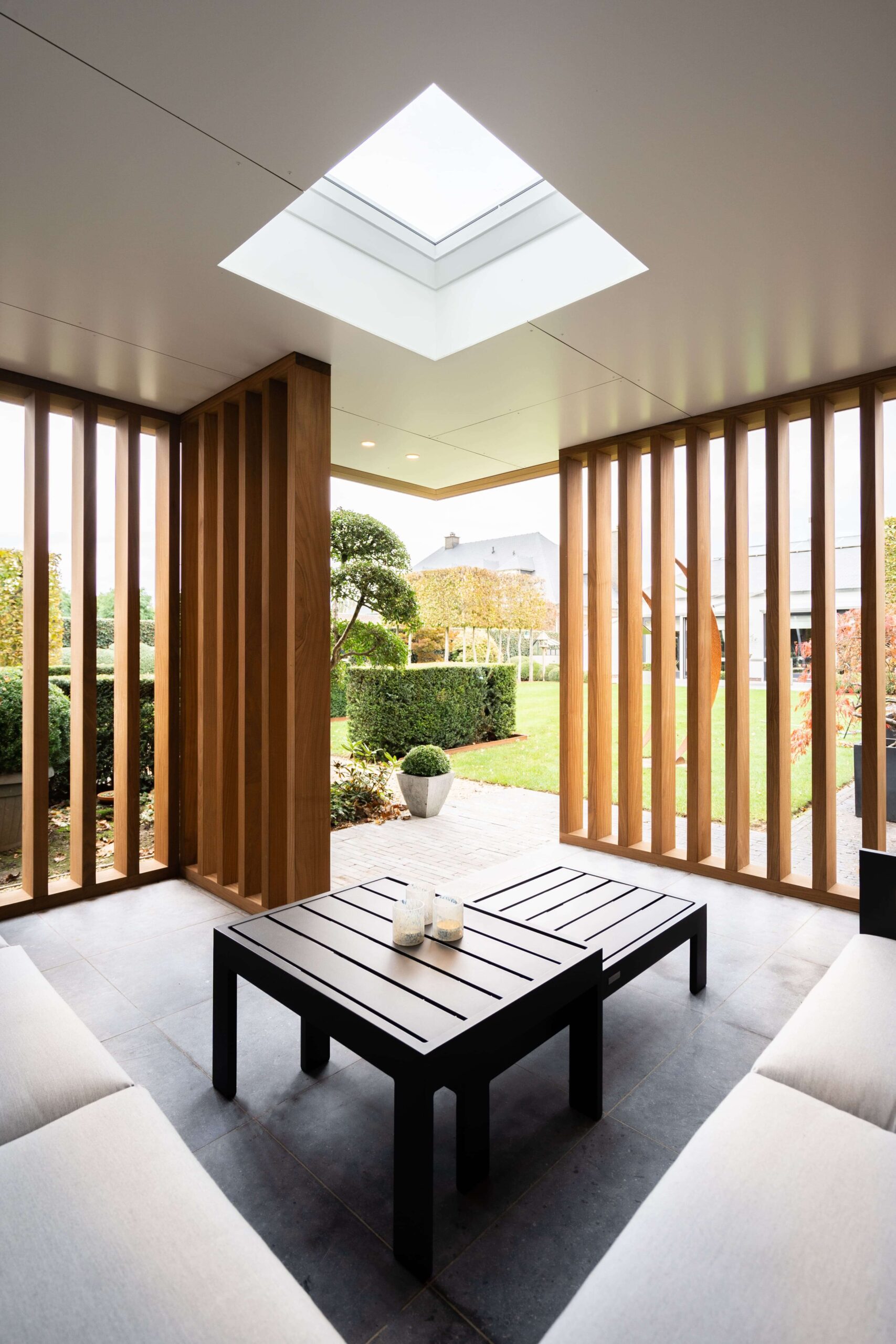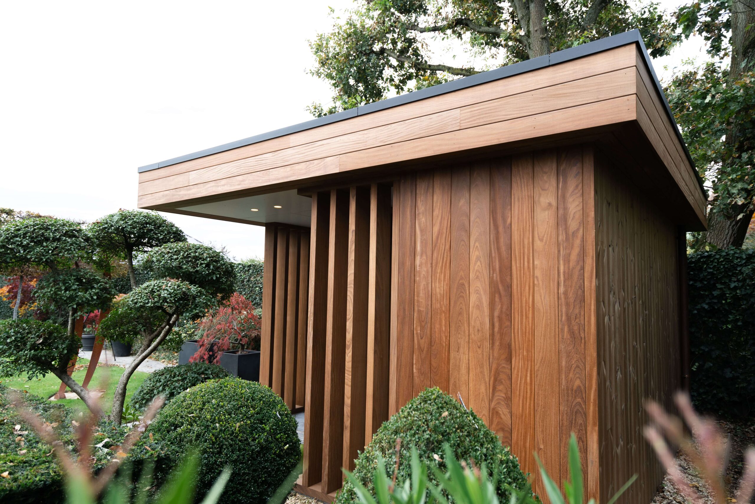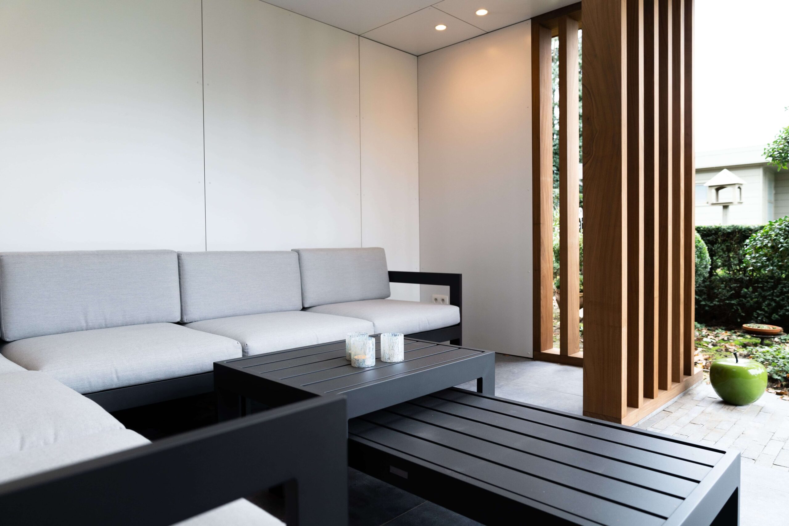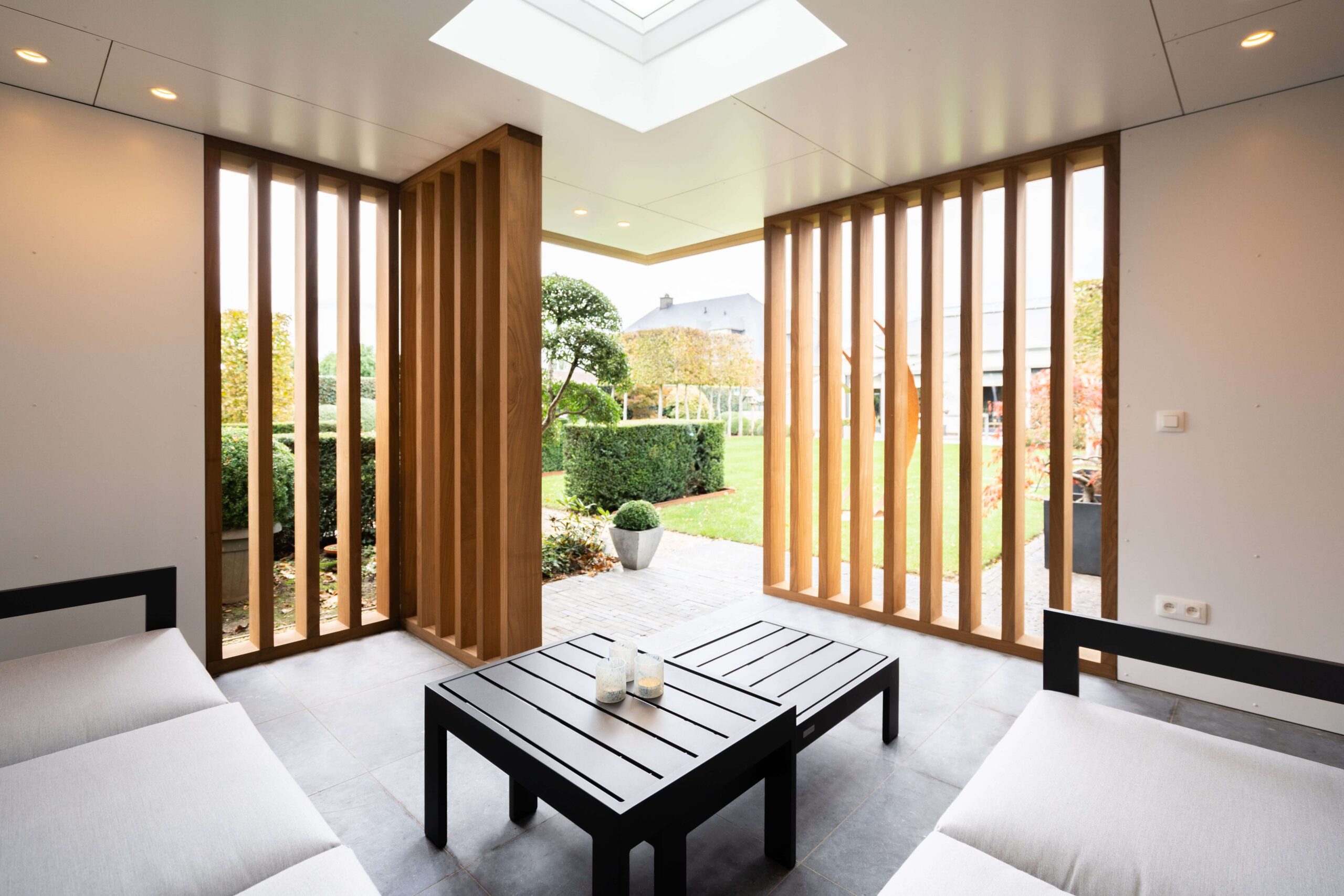 Een bijgebouw met lattenwerk houtsoort Afrormosia die opgaat in zijn natuurlijke omgeving en tuin. Het ontwerp van de houten constructie kwam er in samenspraak met de klant. Het is een ‘tuin-huis’ in de haast letterlijke betekenis van het woord. Er is plaats voor een mooie zit- en relaxruimte. Aan de binnenzijde werd gebruik gemaakt van een wit accent om het ruimtegevoel te vergroten.
