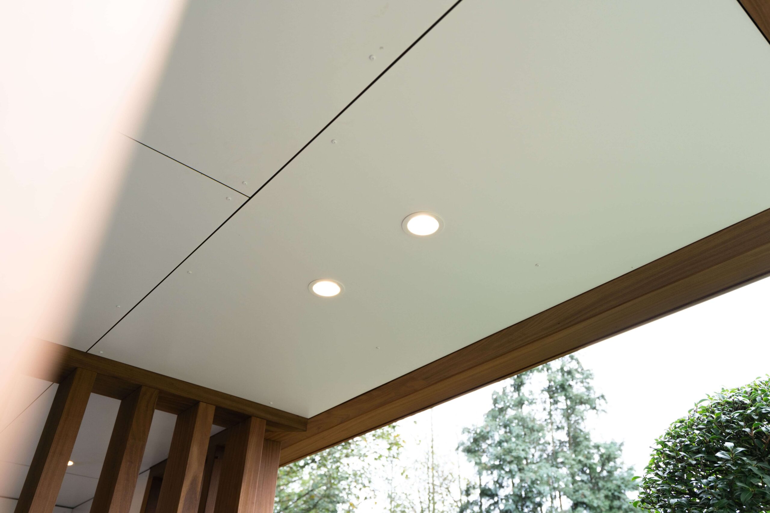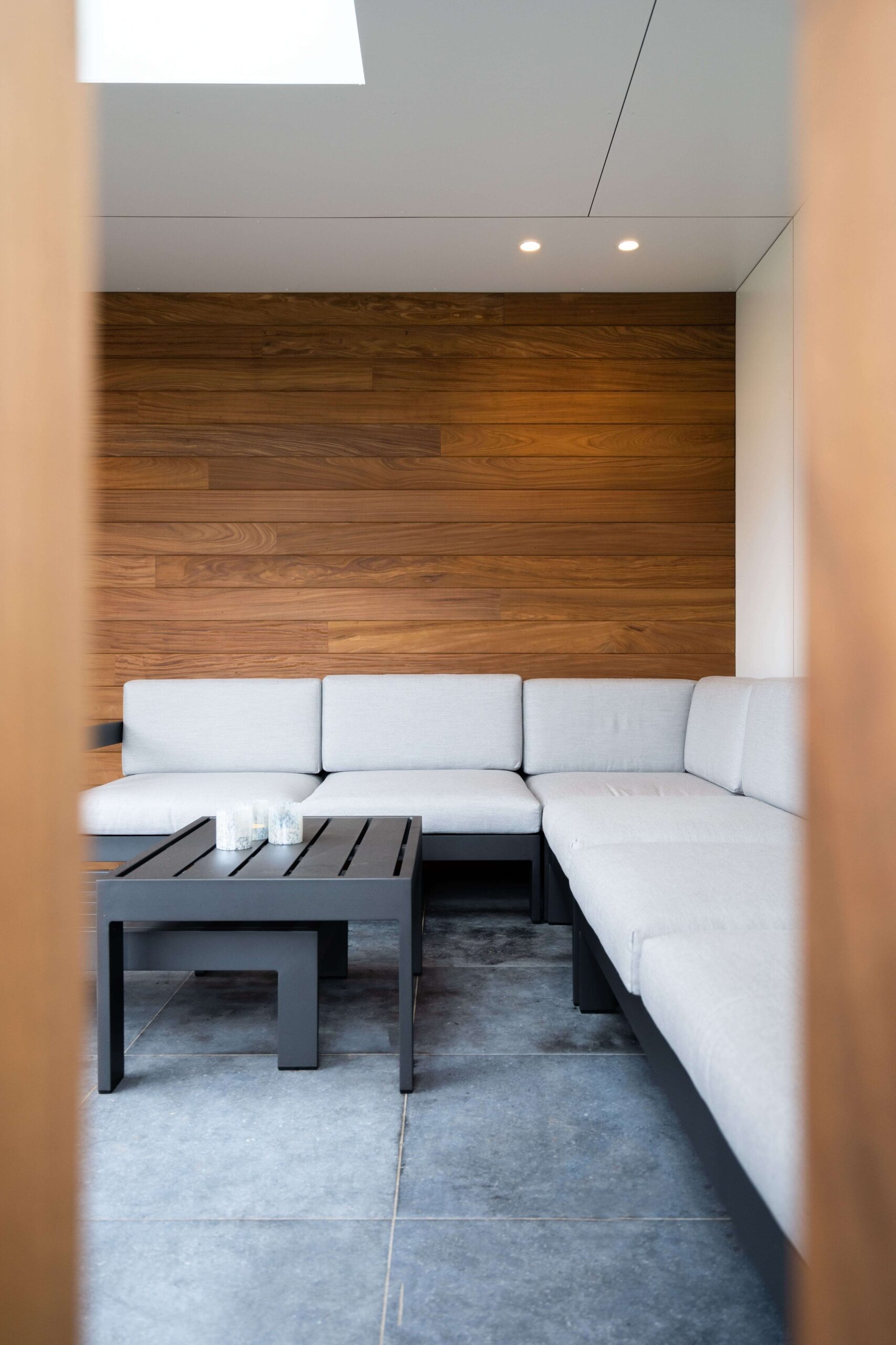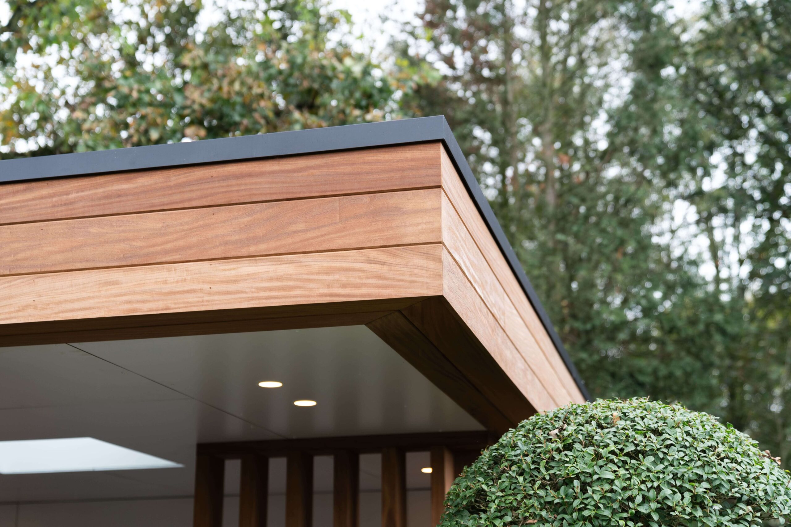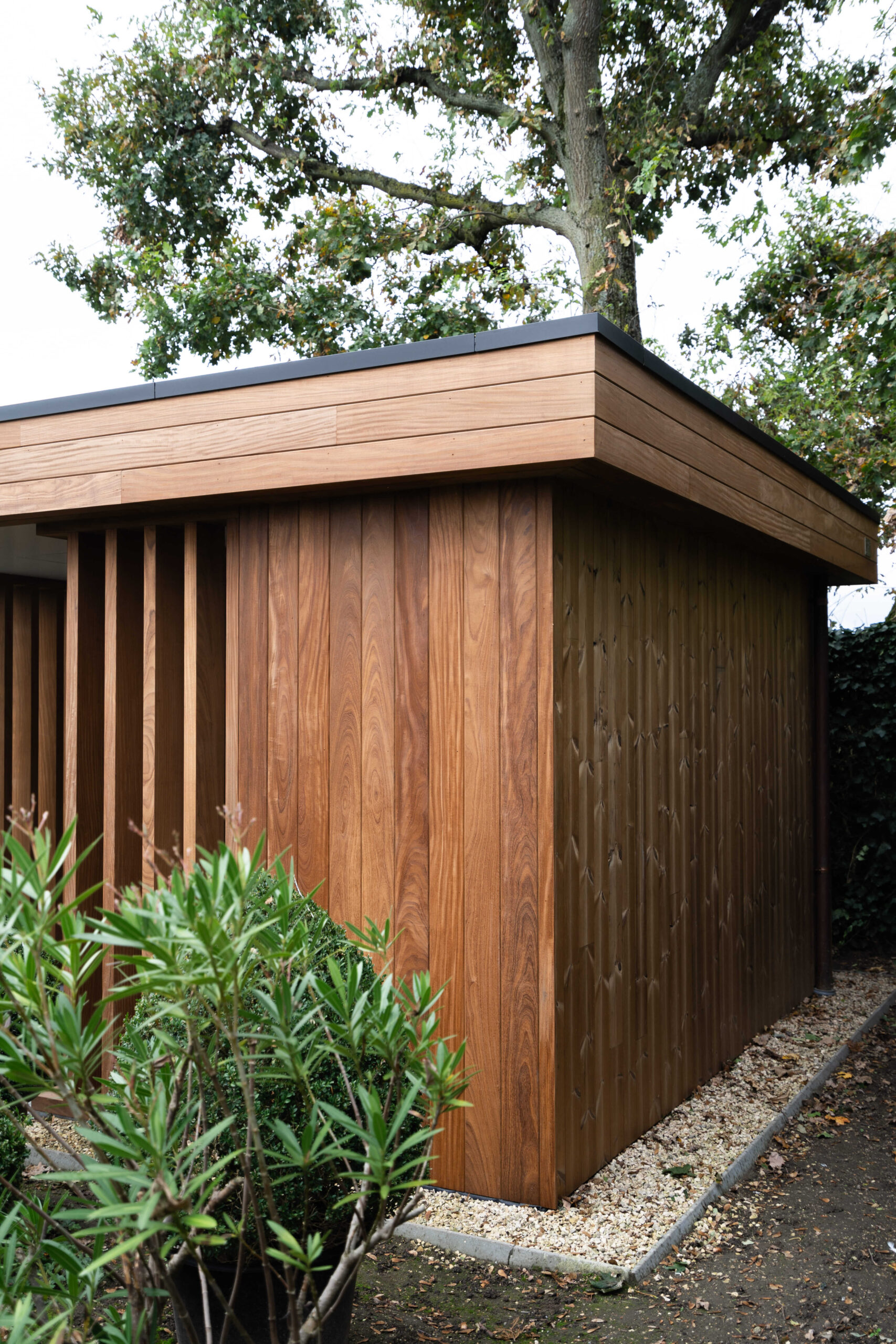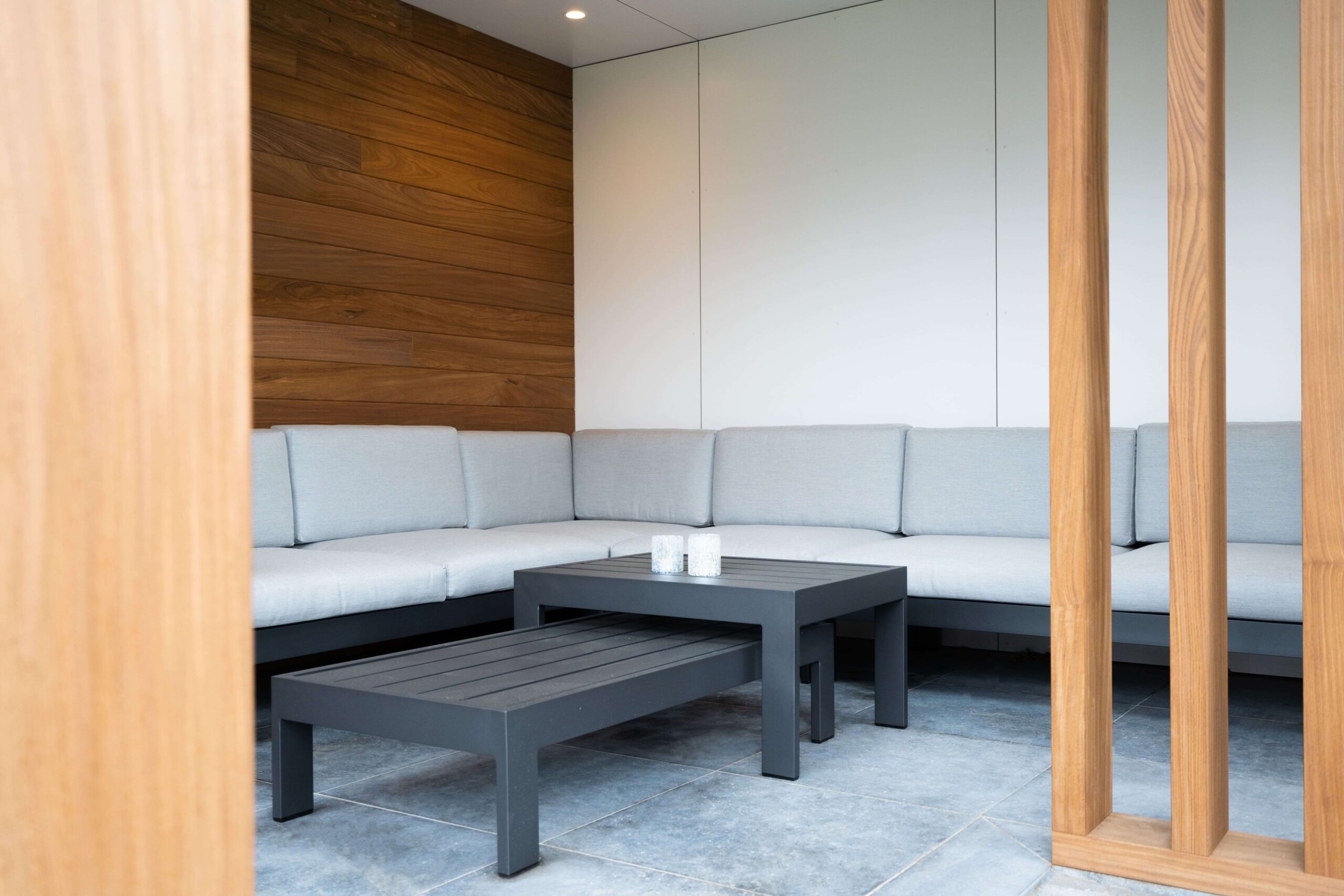 Een bijgebouw met lattenwerk houtsoort Afrormosia die opgaat in zijn natuurlijke omgeving en tuin. Het ontwerp van de houten constructie kwam er in samenspraak met de klant. Het is een ‘tuin-huis’ in de haast letterlijke betekenis van het woord. Er is plaats voor een mooie zit- en relaxruimte. Aan de binnenzijde werd gebruik gemaakt van een wit accent om het ruimtegevoel te vergroten.