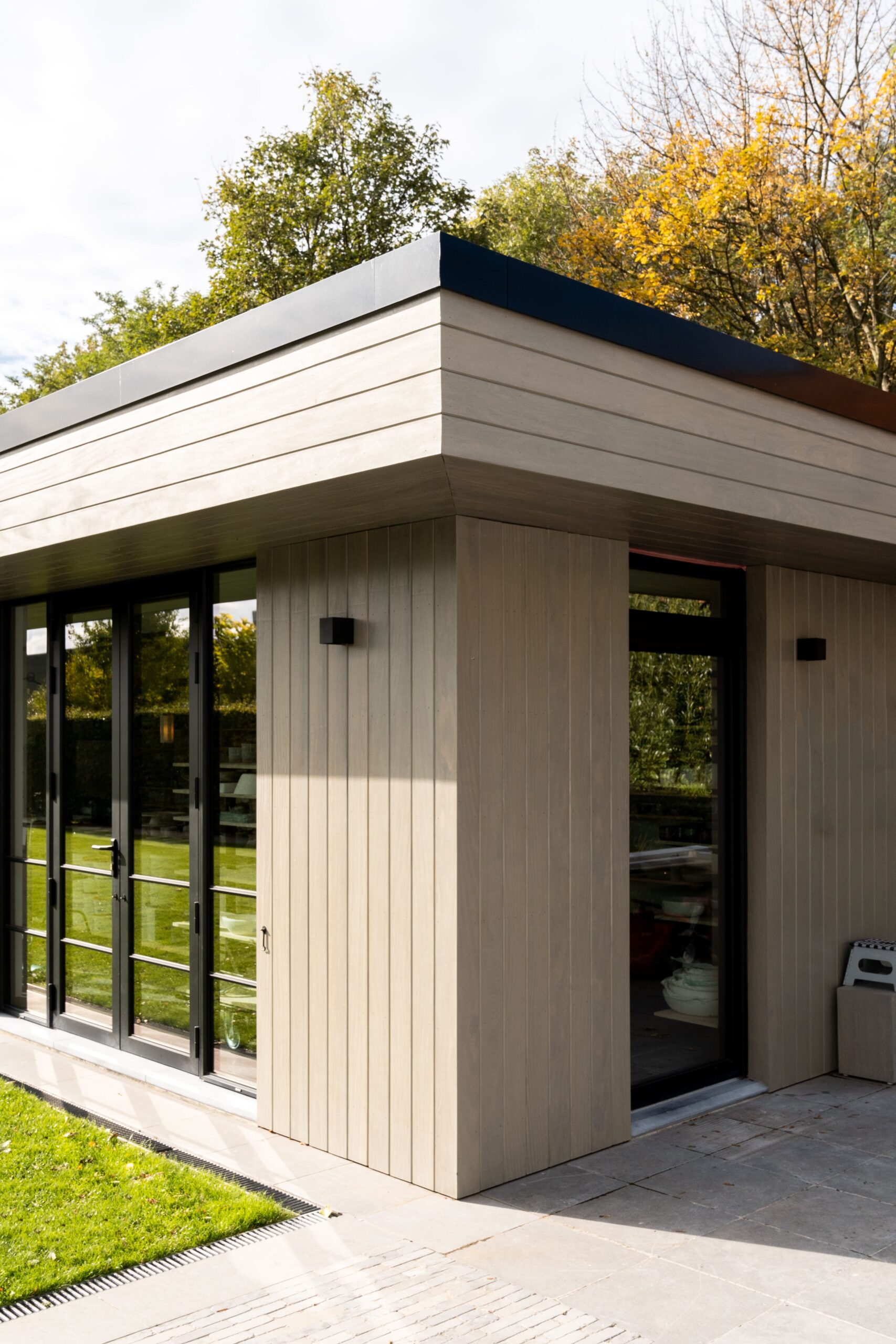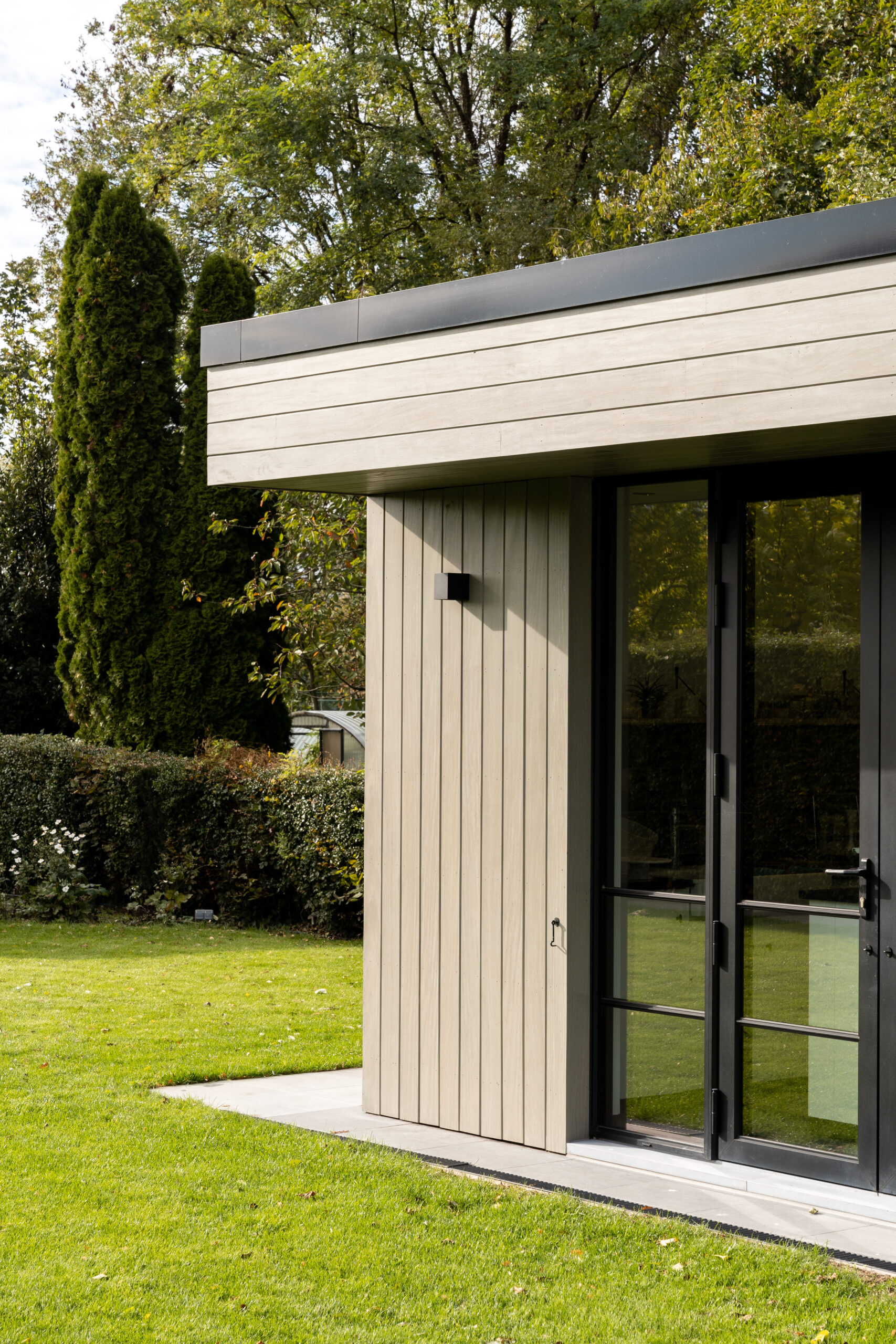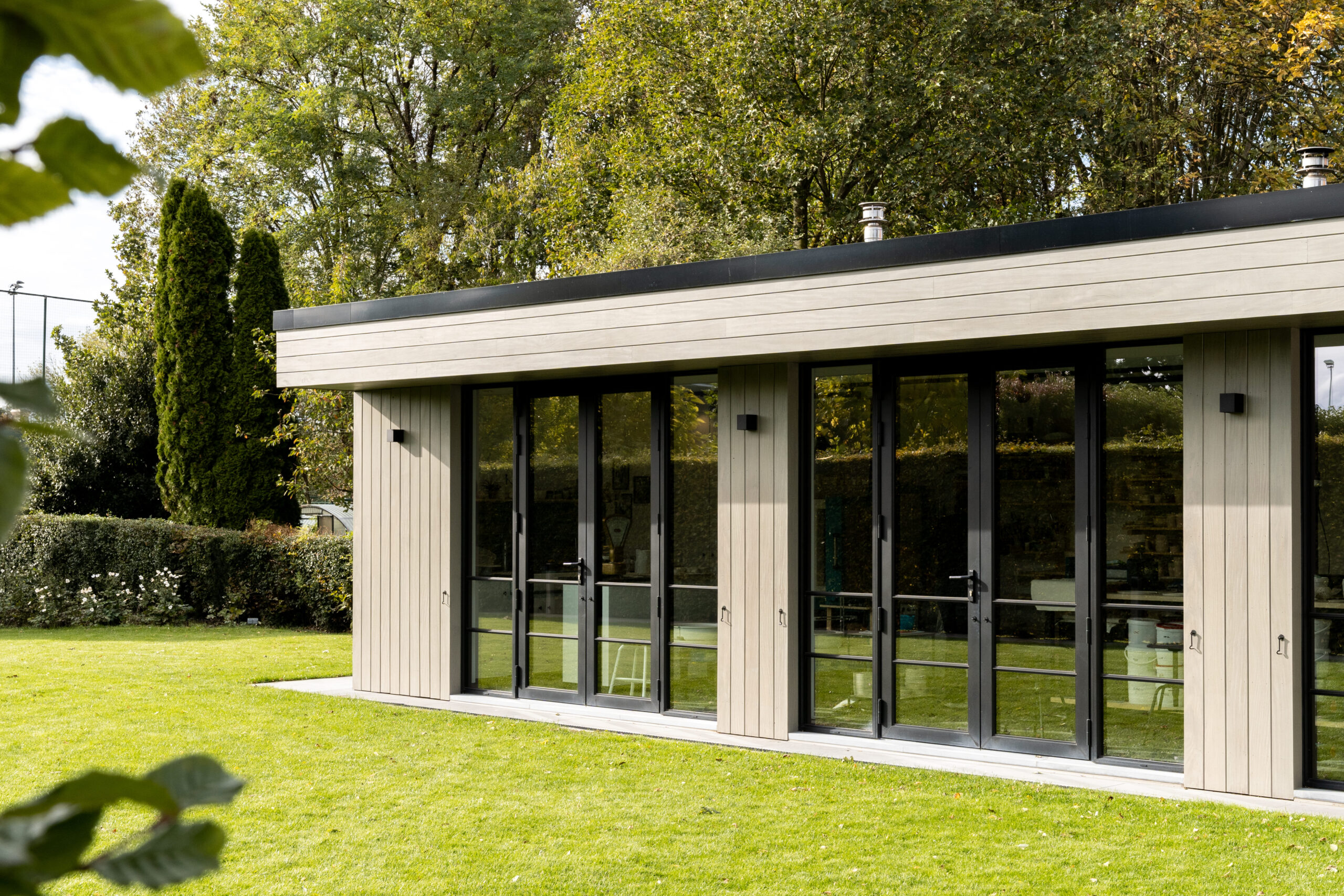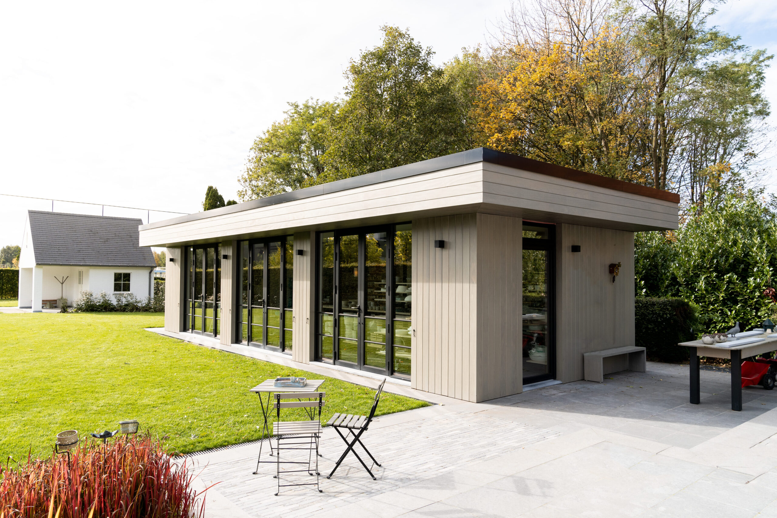Een exclusief bijgebouw in houtsoort Afrormosia, dient als werkatelier in eigen tuin voor handgedraaide keramiek. Het ontwerp en productie werd exclusief op maat uitgevoerd, in harmonie met de eigen woonstijl. Het interieur werd ook voorzien van het nodige maatwerk in natuurlijke materialen.